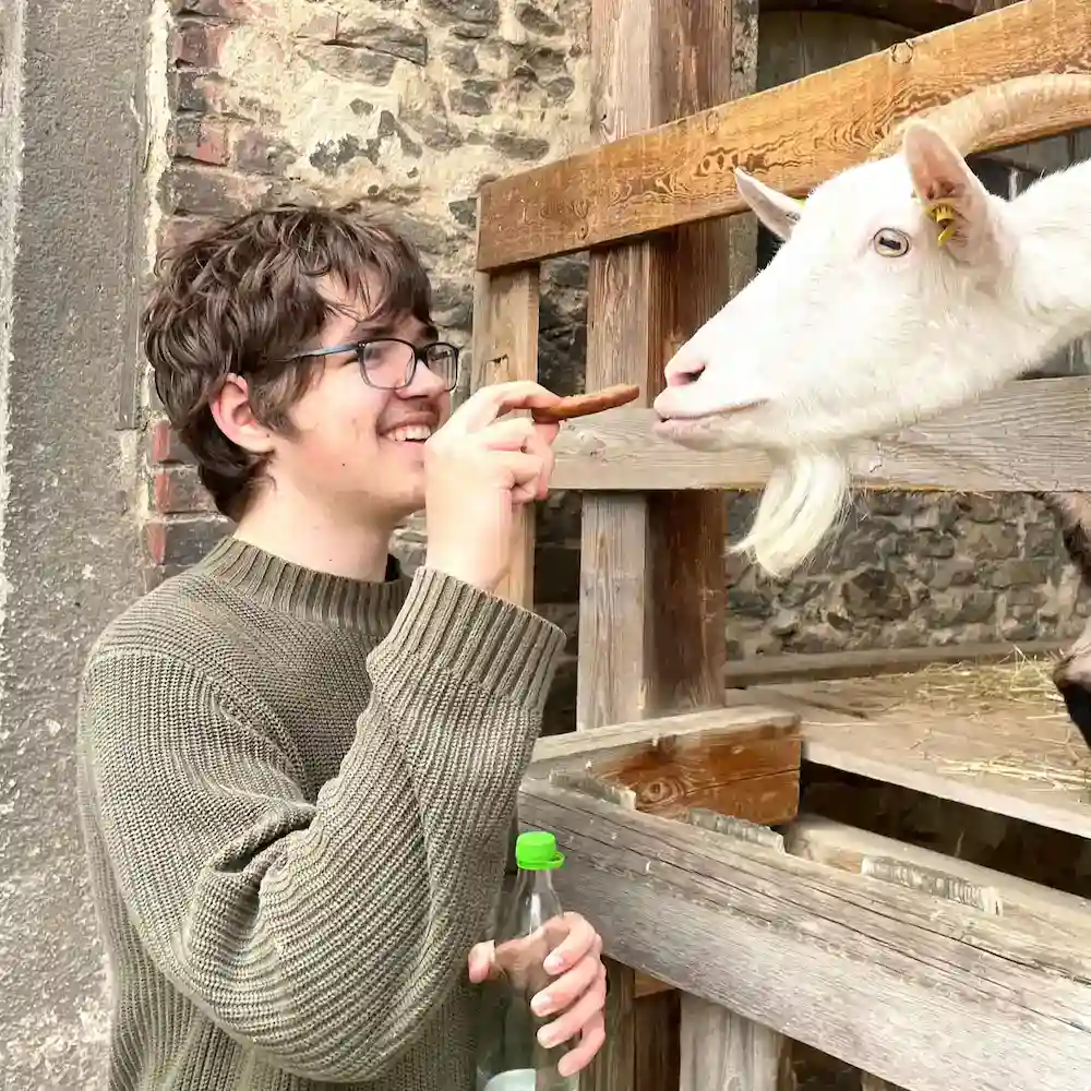 "Ob Ziegen füttern, Stall ausmisten, kuscheln oder anpacken. Ich bin immer dabei und kümmere mich um das Wohl der Ziegen."…