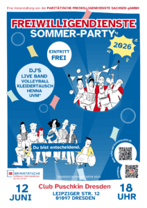 Gemeinsam feiern wir freiwilliges Engagement: wir laden alle aktuellen und ehemaligen Freiwilligen und ihre Freunde, sowie Einsatzstellen, Kooperationspartner*innen und Freunde am 12.06.2026 zum feiern in den Strandgarten des Club Puschkin Dresden ein. 18Uhr geht’s los. Eintritt frei.